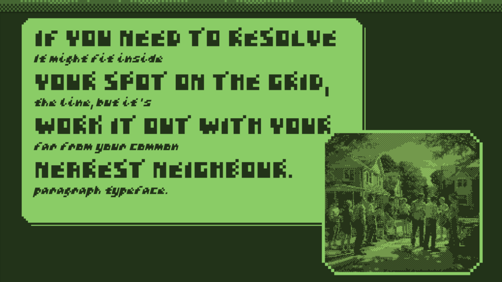 If you need to resolve your spot on the grid, work it out with your nearest neighbour. The spirit of cooperation permeates this specialty display typeface.